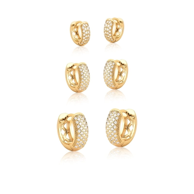 Trio de argolas cravejadas e arredondadas.